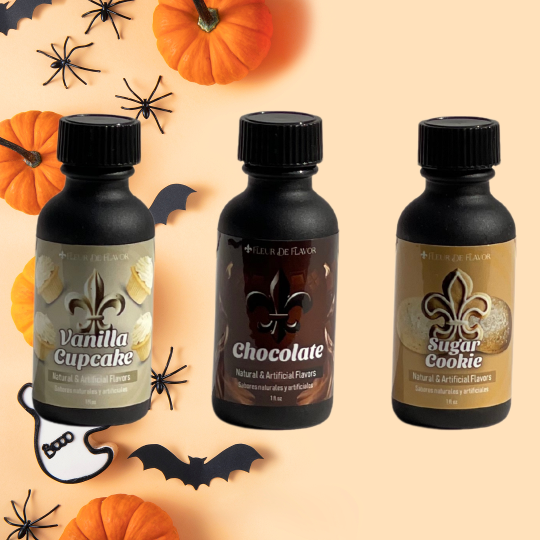 The Fleur De Flavor Mini Halloween Trio is the perfect bundle for fall baking fun. Featuring three of our top-selling bakery-style emulsions in 1 oz bottles, this limited-edition set brings bold, nostalgic flavor to every cupcake, cookie, and Halloween treat.